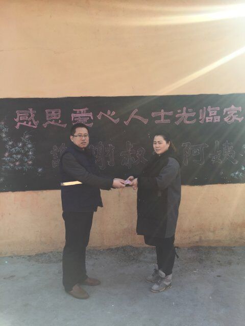 公司領(lǐng)導(dǎo)代表全體員工將愛心款交給孤兒院院長(zhǎng)。