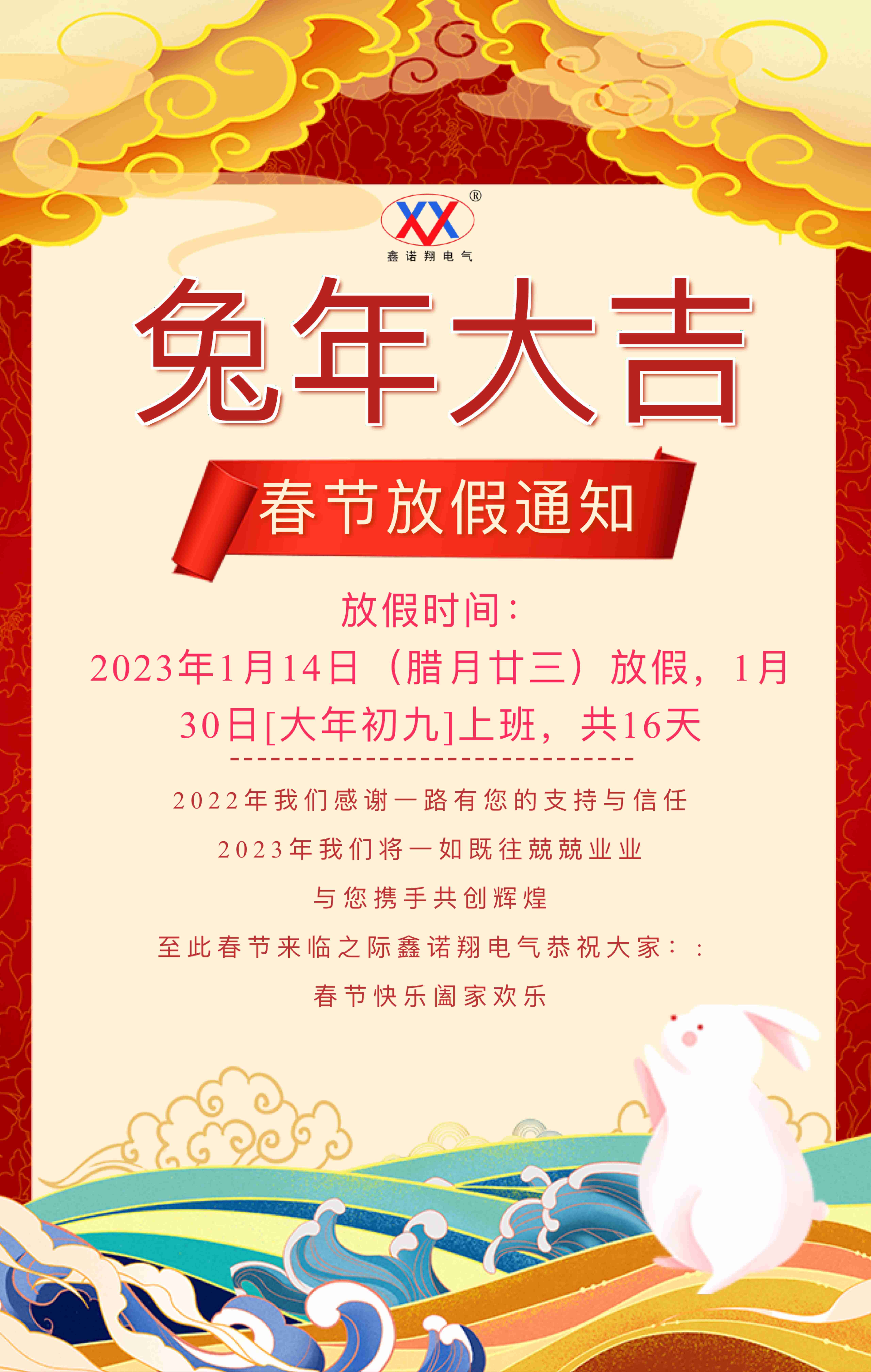 2023年春節(jié)放假通知 各位尊敬的鑫諾翔用戶:大家好! 一年一度的新春佳節(jié)即將來臨,鑫諾翔全體員工向您致以誠摯的祝福和問候,提前祝大家新春愉快! 感謝大家長期以來對我公司的支持與信任,祝您在即將到來的兔年萬事順意,生意興隆,財源滾滾! 為了讓公司全體同仁度過一個歡樂祥和的春節(jié),同時根據(jù)《國務(wù)院辦公廳關(guān)于2023年部分節(jié)假日安排的通知》中的相關(guān)規(guī)定,結(jié)合我公司實際情況,我公司2023年春節(jié)放假安排通知如下: 我公司春節(jié)放假時間為:2023年1月14日(臘月二十三)放假,1月30日(正月初九)上班,共計16天。 春節(jié)假期內(nèi)我公司不再提供詢價、報價及其他技術(shù)支持服務(wù),不便之處,敬請大家諒解。在春節(jié)休假期間,如有緊急事務(wù),請聯(lián)系王經(jīng)理 13722279995,謝謝!